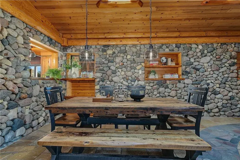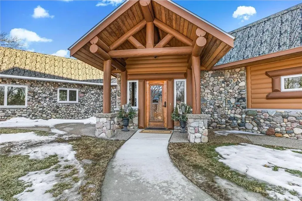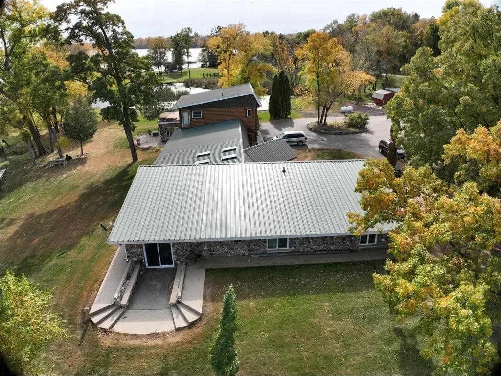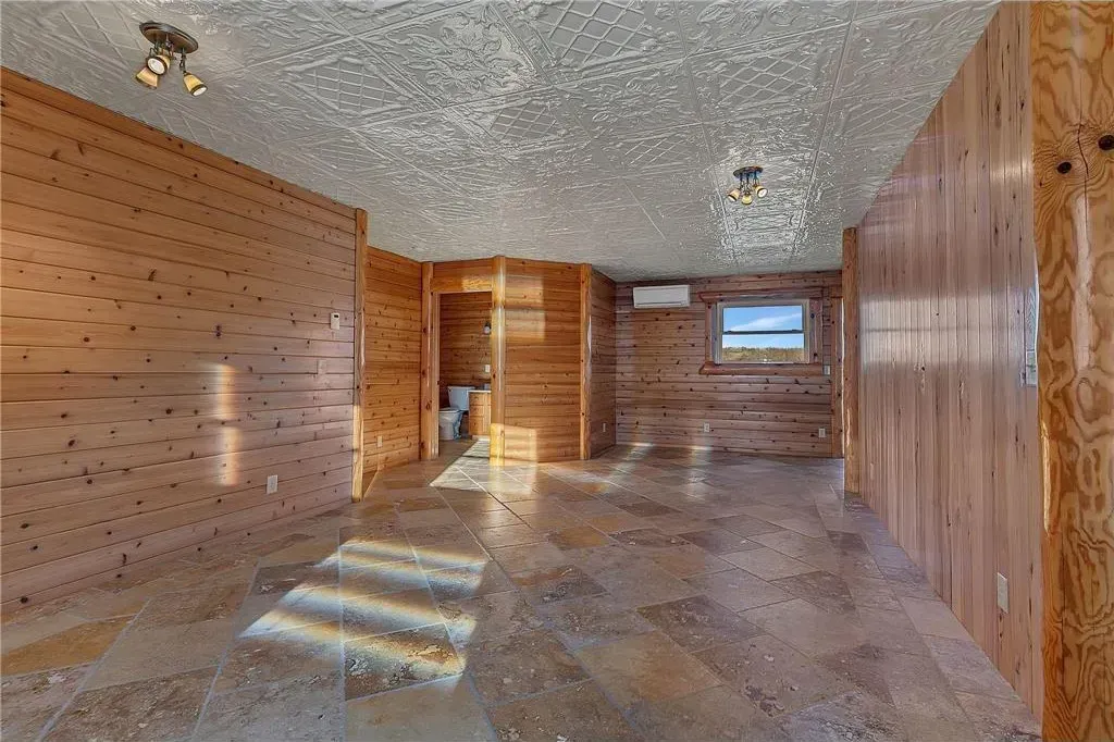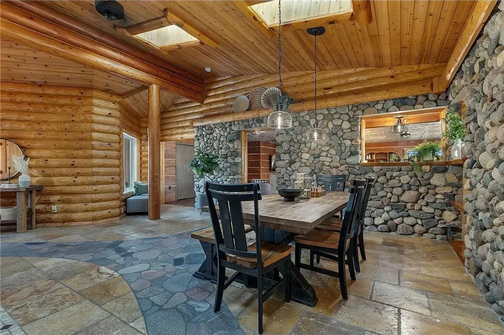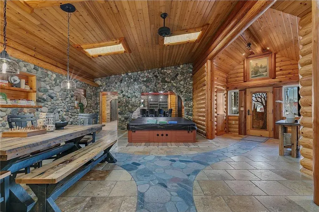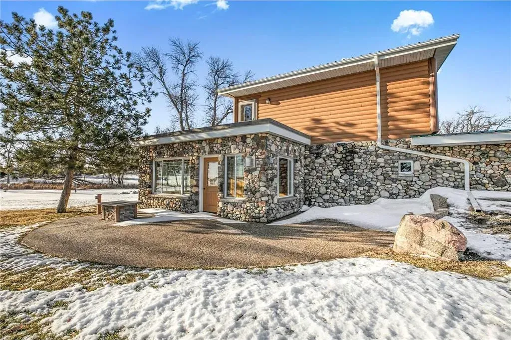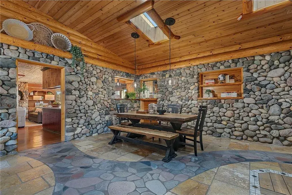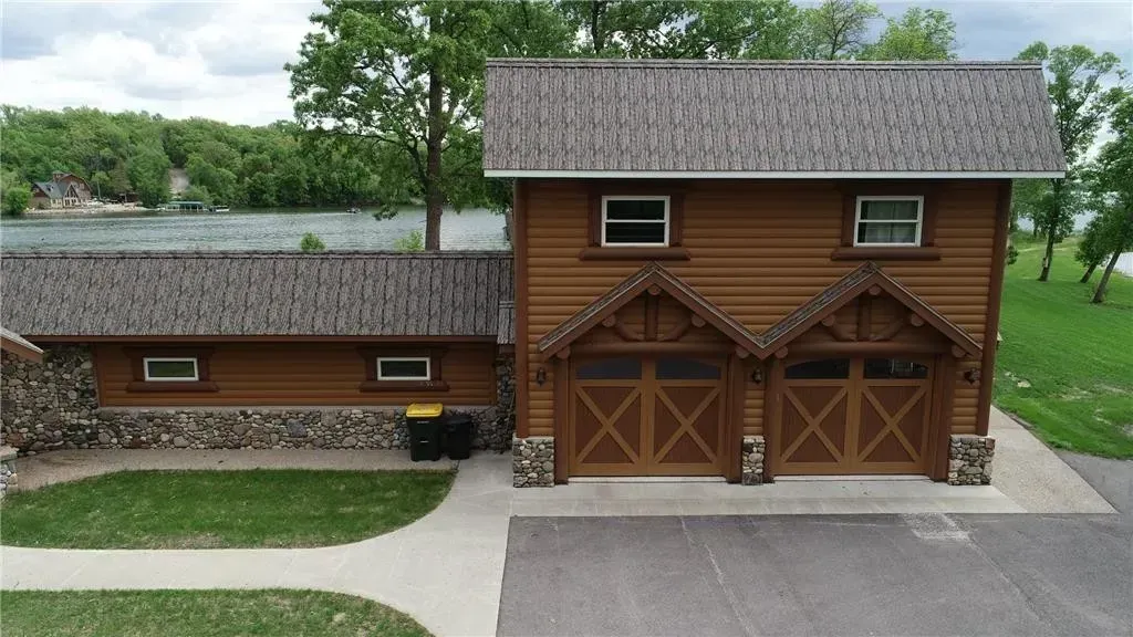 The original 1979 home was transformed with a thoughtfully designed addition featuring in-floor heat throughout, including the upper level above the garage. Inside, the home is rich with character and authentic materials rarely seen today—travertine tile, cut stone, fieldstone, Douglas fir flooring, oak doors, cedar ceilings, stamped steel ceilings, and stunning masonry details throughout. Stone, brick, wood, and log walls blend seamlessly, all finished with meticulous attention to detail. The lakeside four-season sunroom offers panoramic water views and year-round enjoyment, while the home’s built-in swim spa and wet bar create the perfect space for entertaining and relaxing after a day on the lake. The septic system is compliant, and the dock is included, making lake life easy from day one. Recent exterior improvements include a new tarred driveway (2024), new concrete apron surrounding the home, and rock retaining walls added in 2021, enhancing both function and curb appeal. Also included is a remarkable heated workshop/barn, built over a new foundation using salvaged rafters and flooring from a historic local barn. This space features a ½ bath, room to service vehicles—including oil changes—and endless possibilities for hobbies, storage, or year-round projects. Set on Kandiyohi County and located on Games Lake, known for excellent boating, fishing, and recreation, this property is unlike anything else on the market—crafted with intention, built with real materials, and designed to be enjoyed for generations.