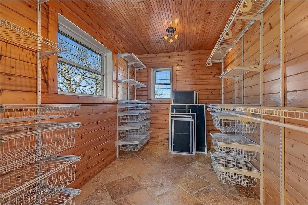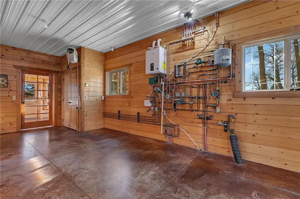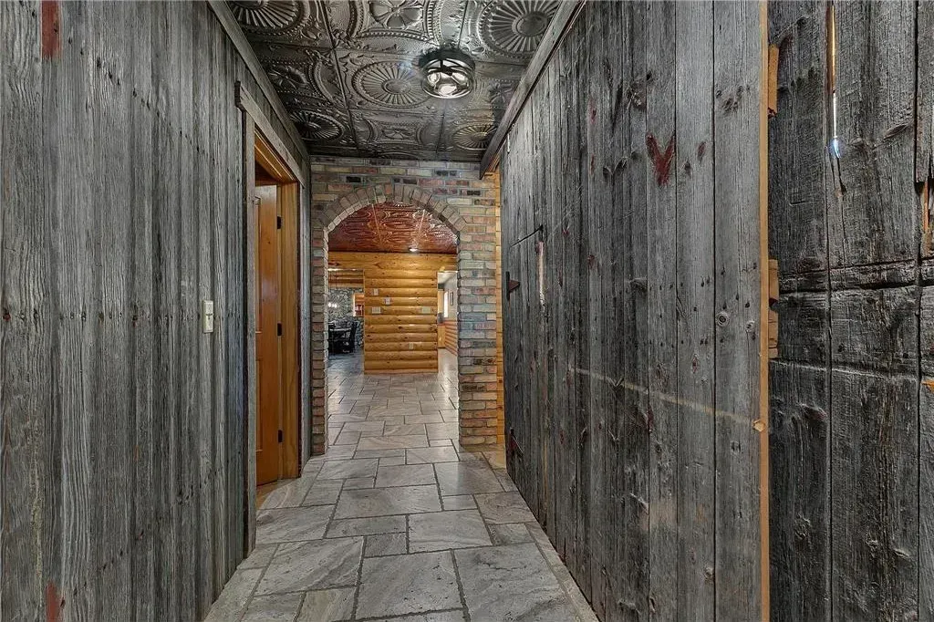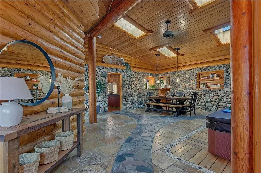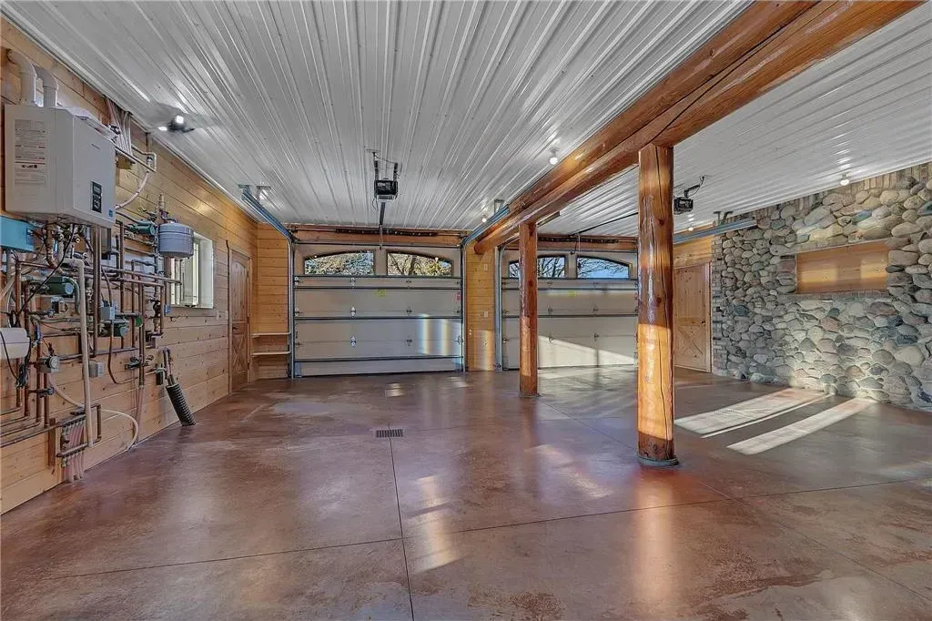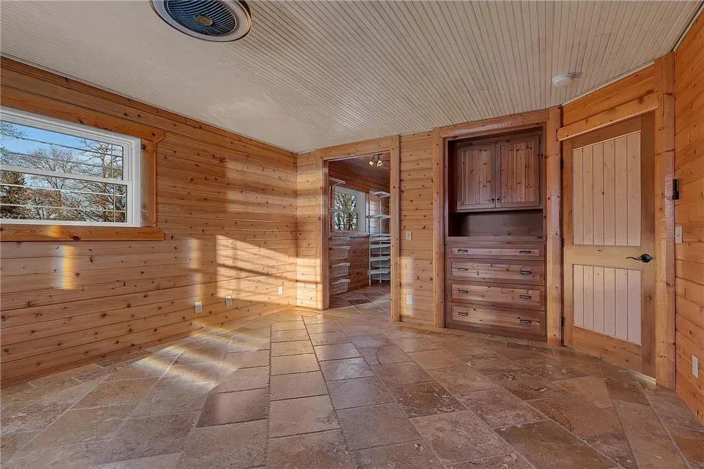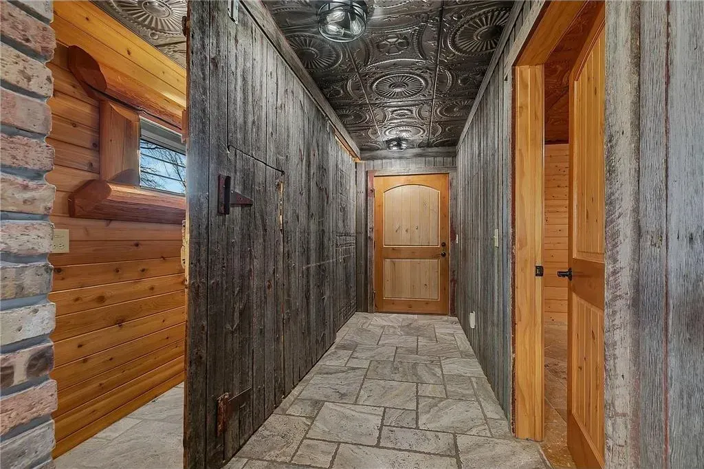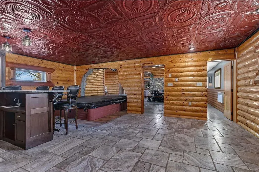 The original 1979 home was transformed with a thoughtfully designed addition featuring in-floor heat throughout, including the upper level above the garage. Inside, the home is rich with character and authentic materials rarely seen today—travertine tile, cut stone, fieldstone, Douglas fir flooring, oak doors, cedar ceilings, stamped steel ceilings, and stunning masonry details throughout. Stone, brick, wood, and log walls blend seamlessly, all finished with meticulous attention to detail. The lakeside four-season sunroom offers panoramic water views and year-round enjoyment, while the home’s built-in swim spa and wet bar create the perfect space for entertaining and relaxing after a day on the lake. The septic system is compliant, and the dock is included, making lake life easy from day one. Recent exterior improvements include a new tarred driveway (2024), new concrete apron surrounding the home, and rock retaining walls added in 2021, enhancing both function and curb appeal. Also included is a remarkable heated workshop/barn, built over a new foundation using salvaged rafters and flooring from a historic local barn. This space features a ½ bath, room to service vehicles—including oil changes—and endless possibilities for hobbies, storage, or year-round projects. Set on Kandiyohi County and located on Games Lake, known for excellent boating, fishing, and recreation, this property is unlike anything else on the market—crafted with intention, built with real materials, and designed to be enjoyed for generations.
