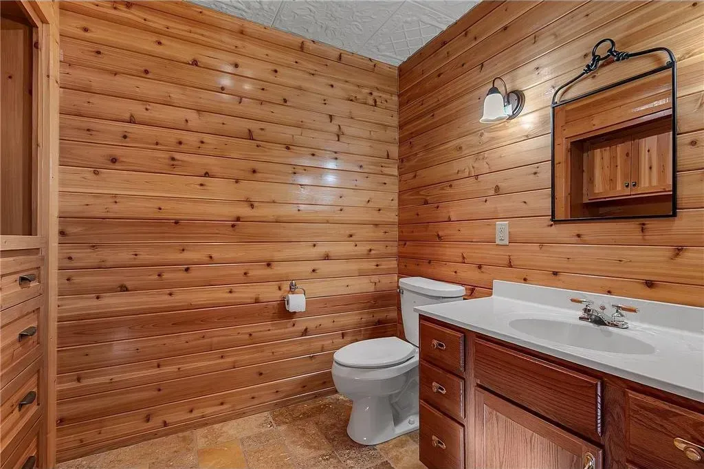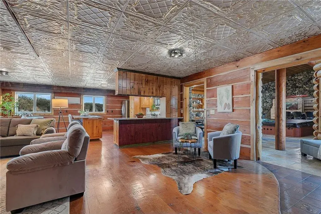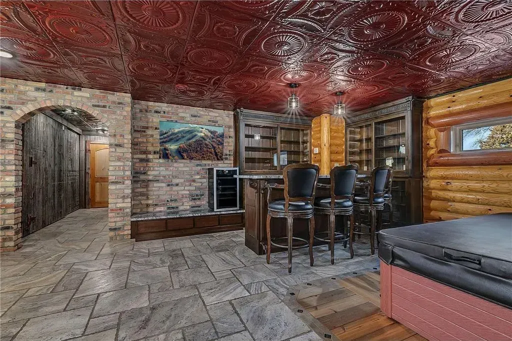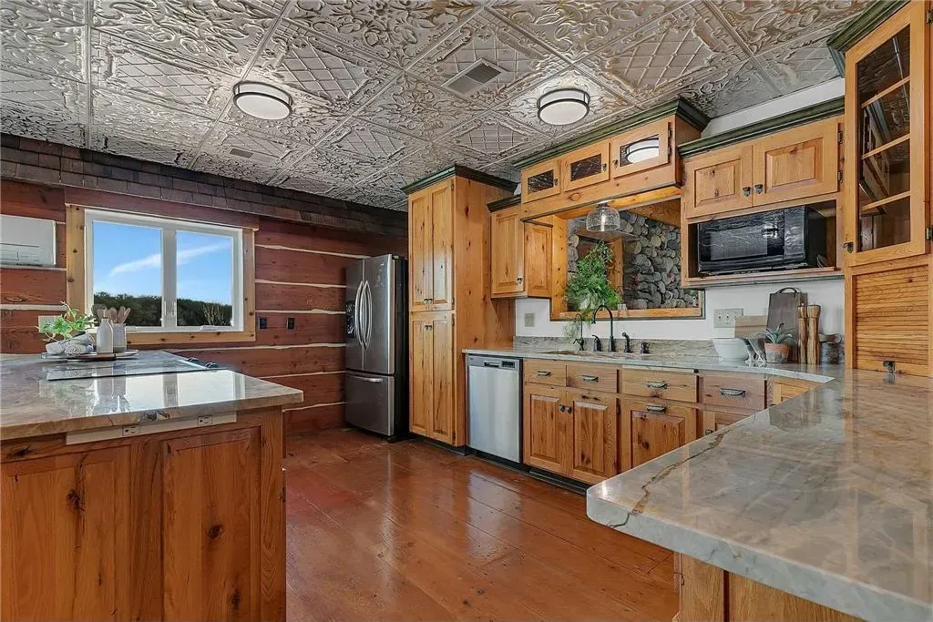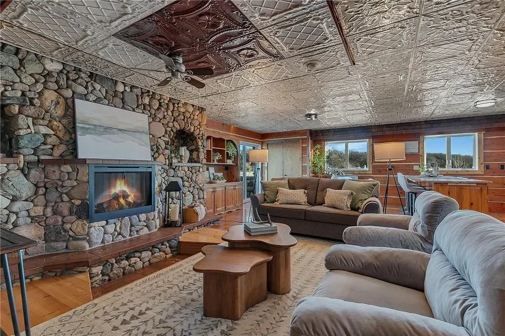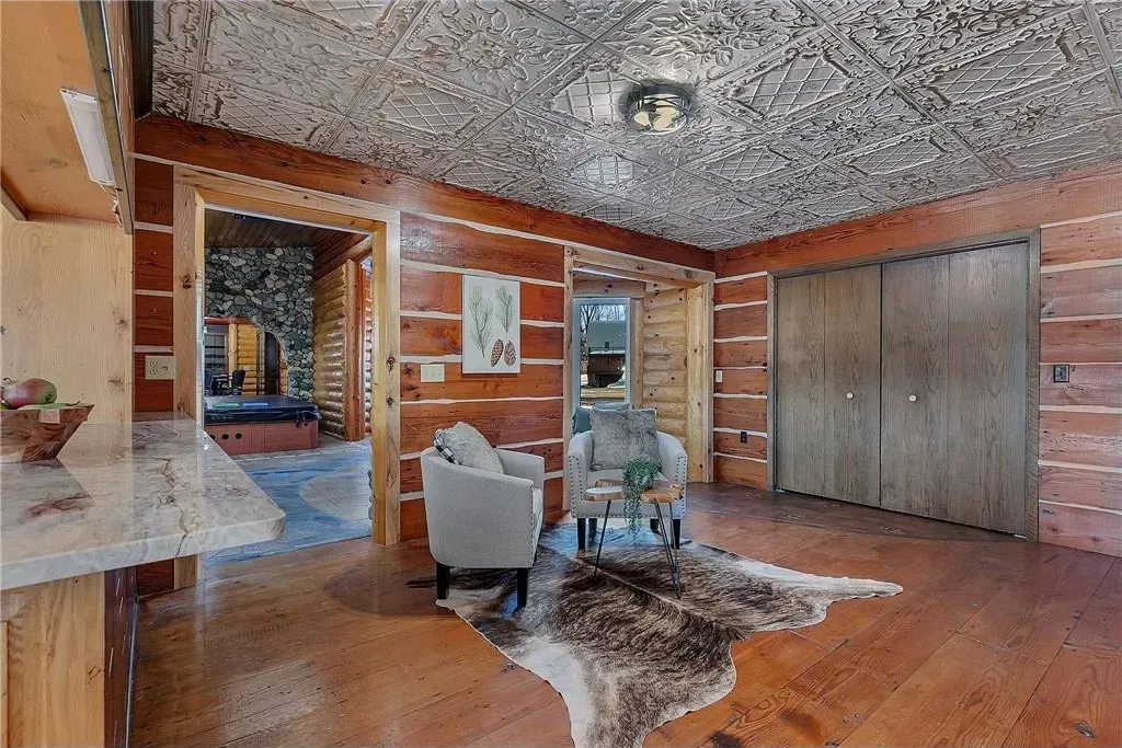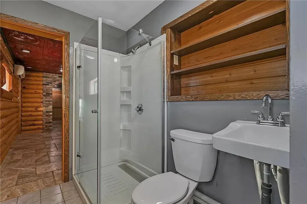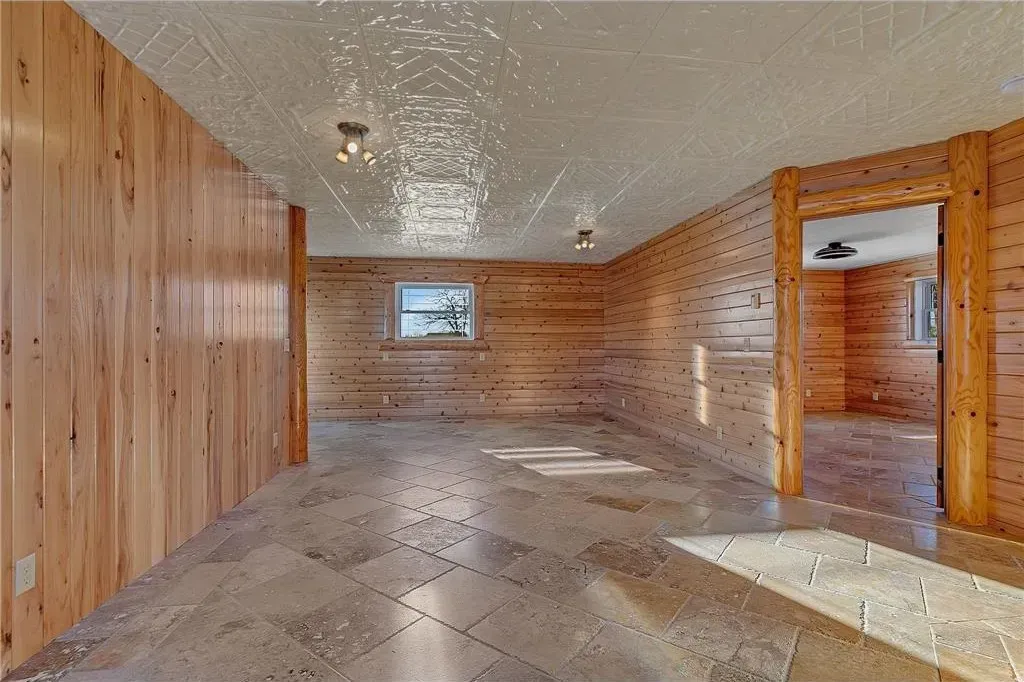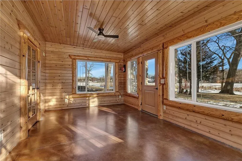 The original 1979 home was transformed with a thoughtfully designed addition featuring in-floor heat throughout, including the upper level above the garage. Inside, the home is rich with character and authentic materials rarely seen today—travertine tile, cut stone, fieldstone, Douglas fir flooring, oak doors, cedar ceilings, stamped steel ceilings, and stunning masonry details throughout. Stone, brick, wood, and log walls blend seamlessly, all finished with meticulous attention to detail. The lakeside four-season sunroom offers panoramic water views and year-round enjoyment, while the home’s built-in swim spa and wet bar create the perfect space for entertaining and relaxing after a day on the lake. The septic system is compliant, and the dock is included, making lake life easy from day one. Recent exterior improvements include a new tarred driveway (2024), new concrete apron surrounding the home, and rock retaining walls added in 2021, enhancing both function and curb appeal. Also included is a remarkable heated workshop/barn, built over a new foundation using salvaged rafters and flooring from a historic local barn. This space features a ½ bath, room to service vehicles—including oil changes—and endless possibilities for hobbies, storage, or year-round projects. Set on Kandiyohi County and located on Games Lake, known for excellent boating, fishing, and recreation, this property is unlike anything else on the market—crafted with intention, built with real materials, and designed to be enjoyed for generations.